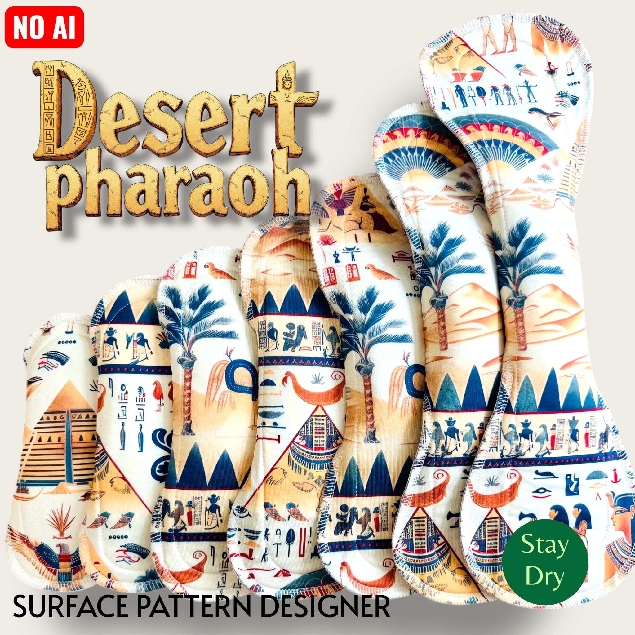 A richly illustrated journey through ancient sands, Desert Pharaoh blends warm desert tones with deep indigos, hieroglyphs, palm trees, and Egyptian motifs for a stunning, story-filled print. Every pad feels like a piece of wearable art.