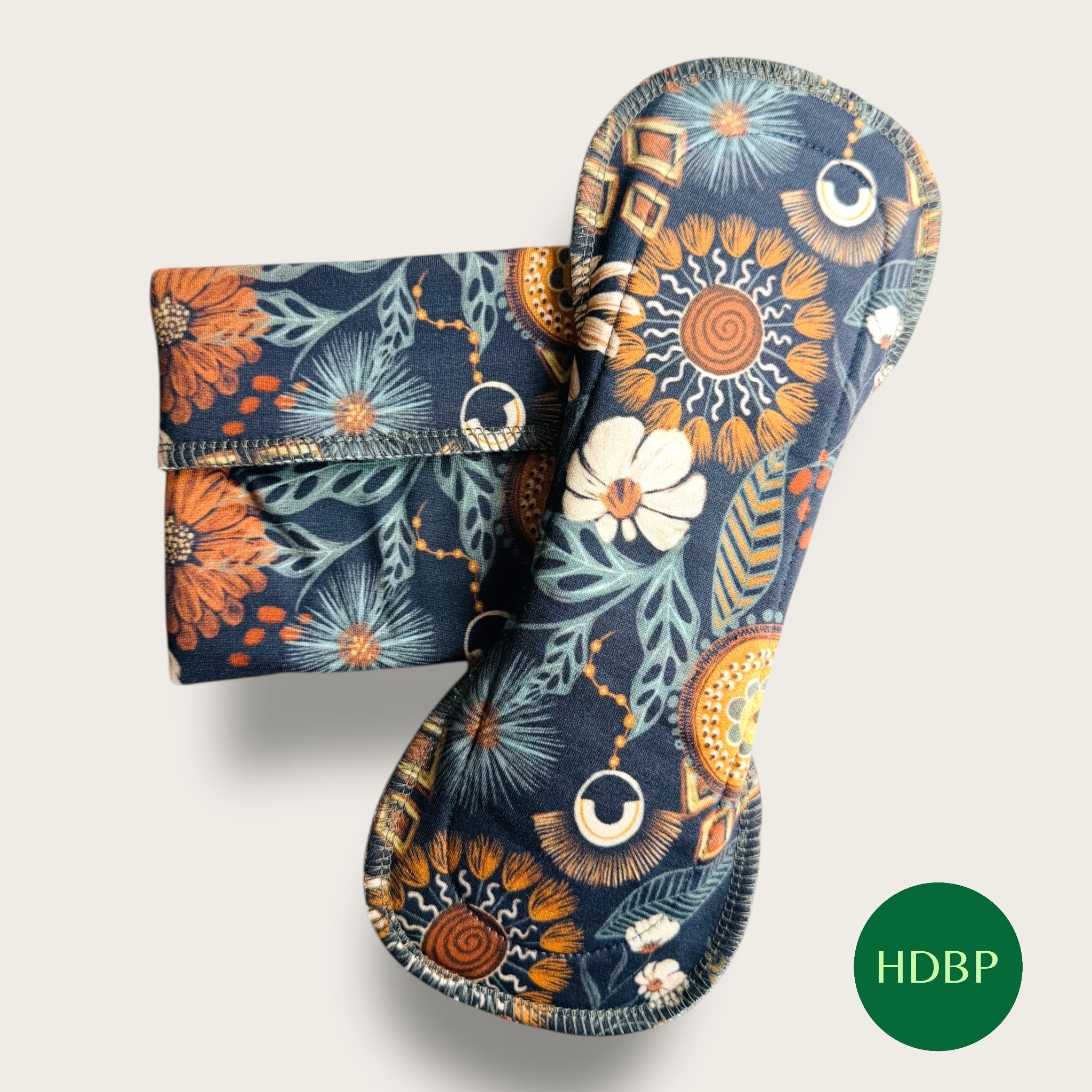 Earthbound Blooms brings a rich, grounded elegance to your cycle. Deep denim-blue tones meet warm terracotta florals, intricate sunbursts, and hand-drawn botanicals for a print that feels earthy, artistic, and effortlessly sophisticated.